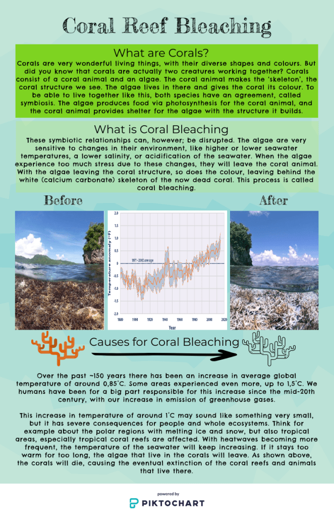 In our infographic we wanted to begin ‘simple’ with an explanation of what corals are, since most people won’t be familiar with that. Then we’re going slightly deeper into the topic with the phenomenon ‘coral bleaching’, which is something that happens on a large scale now, and how it ties in with the current climate warming.To make the explanation better understandable we tried to visualise the text with pictures.
